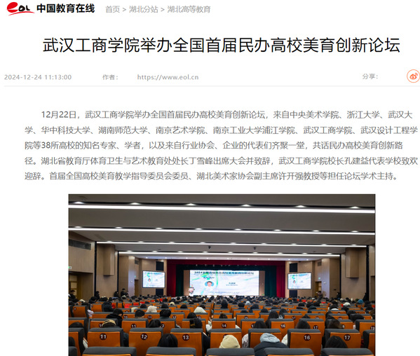 12月22日,武汉工商学院举办全国首届民办高校美育创新论坛,来自中央美术学院、浙江大学、武汉大学、华中科技大学、湖南师范大学、南京艺术学院、南京工业大学浦江学院、武汉工商学院、武汉设计工程学院等38所高校的知名专家、学者,以及来自行业协会、企业的代表们齐聚一堂,共话民办高校美育创新路径。湖北省教育厅体育卫生与艺术教育处处长丁雪峰出席大会并致辞,武汉工商学院校长孔建益代表学校致欢迎辞。首届全国高校美育教学指导委员会委员、湖北美术家协会副主席许开强教授等担任论坛学术主持。