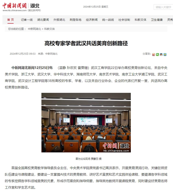 中新网湖北新闻12月25日电(蓝静 孙欢欢 雷雯珊)武汉工商学院22日举办高校美育创新论坛,来自中央美术学院、浙江大学、武汉大学、华中科技大学、湖南师范大学、南京艺术学院、南京工业大学浦江学院、武汉工商学院、武汉设计工程学院等38所高校的专家、学者,以及来自行业协会、企业的代表们齐聚一堂,共话民办高校美育创新路径。