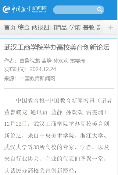 中国教育报-中国教育新闻网讯(记者 董鲁皖龙 通讯员 蓝静 孙欢欢 雷雯珊)12月22日,武汉工商学院举办高校美育创新论坛,来自中央美术学院、浙江大学、武汉大学等38所高校的专家、学者,以及来自行业协会、企业的代表们齐聚一堂,共话民办高校美育创新路径。