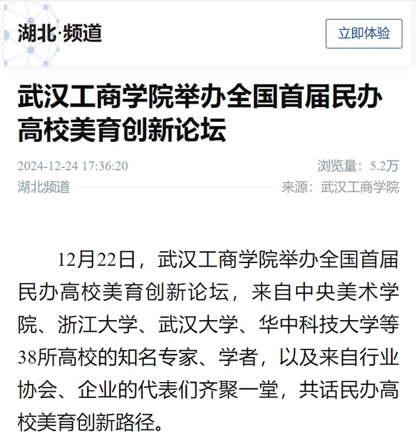 12月22日,武汉工商学院举办全国首届民办高校美育创新论坛,来自中央美术学院、浙江大学、武汉大学、华中科技大学等38所高校的知名专家、学者,以及来自行业协会、企业的代表们齐聚一堂,共话民办高校美育创新路径。