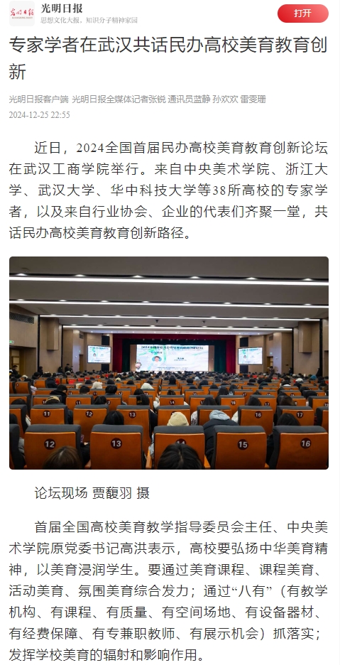 近日,2024全国首届民办高校美育教育创新论坛在武汉工商学院举行。来自中央美术学院、浙江大学、武汉大学、华中科技大学等38所高校的专家学者,以及来自行业协会、企业的代表们齐聚一堂,共话民办高校美育教育创新路径。