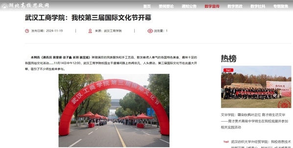 本网讯(通讯员 雷雯珊 徐子鑫 张羽 熊昱淞)琳琅满目的民族服饰和手工艺品、散发着诱人香气的各国特色美食、趣味十足的各国民俗文化活动……11月14日中午12:00,武汉工商学院校园主干道博问路上热闹非凡、人头攒动,第三届国际文化节在此盛大开幕,吸引了不少师生前来参与。