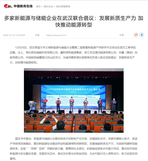 12月26日,武汉首届大学之城新能源与储能大会暨第二届智慧新能源产学研学术交流会在武汉工商学院启幕。会上,湖北君安储能科技有限公司、鑫和绿色能源集团、浙江禾迈清洁能源有限公司、协鑫(集团)控股有限公司、中国邮政储蓄银行洪山区支行、光储充精英俱乐部等单位负责人联合发起倡议:发展新质生产力,加快推动能源转型。