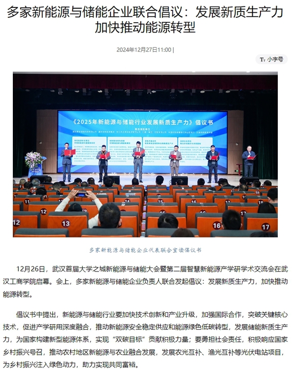12月26日,武汉首届大学之城新能源与储能大会暨第二届智慧新能源产学研学术交流会在武汉工商学院启幕。会上,多家新能源与储能企业负责人联合发起倡议:发展新质生产力,加快推动能源转型。