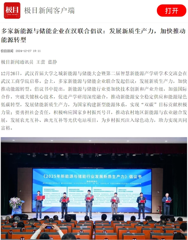 12月26日,武汉首届大学之城新能源与储能大会暨第二届智慧新能源产学研学术交流会在武汉工商学院启幕。会上,多家新能源与储能企业联合发起倡议:发展新质生产力,加快推动能源转型。倡议书中提出,新能源与储能行业要加快技术创新和产业升级,加强国际合作,突破关键核心技术,促进产学研用深度融合,推动新能源安全稳定供应和能源绿色低碳转型,发展储能新质生产力,为国家构建新型能源体系,实现“双碳”目标贡献积极力量;要勇担社会责任,积极响应国家乡村振兴号召,推动农村地区新能源与农业融合发展,发展农光互补、渔光互补等光伏电站项目,为乡村振兴注入绿色动力,助力实现共同富裕。