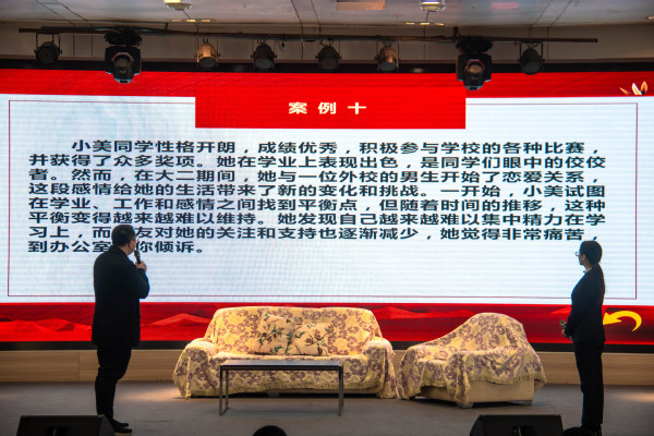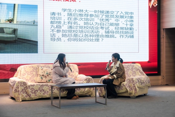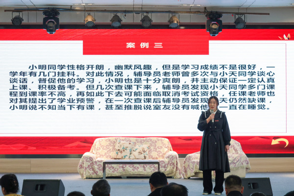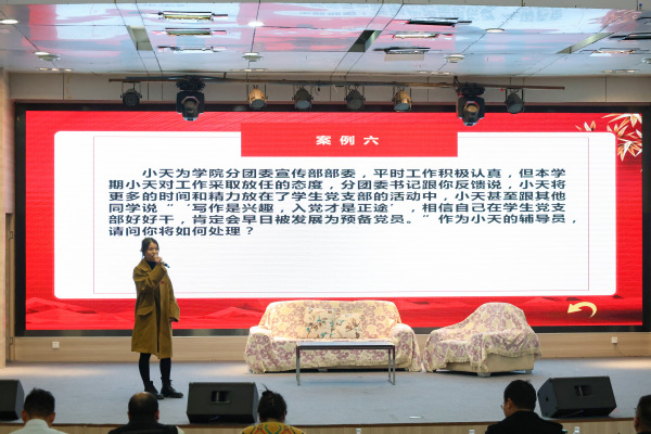 第七届辅导员素质能力大赛共吸引了全校65名辅导员的参与,经过初赛环节,最终共有10名辅导员进入复赛。复赛由“案例面对面”案例研讨以及“成长心连心”谈心谈话两个环节构成,对辅导员在思想政治教育工作中的表现、相关业务技能与专业知识的掌握、理论分析与问题解决能力、应急处理能力,以及对学生特点、成长规律的理解和把握,还有在教育引导学生、解答理论疑惑和处理实际问题方面的能力进行全面考察。