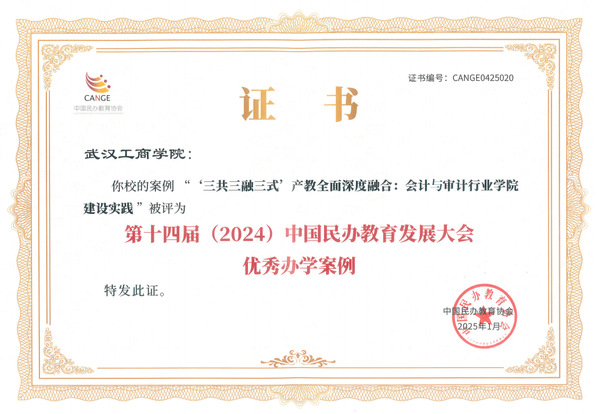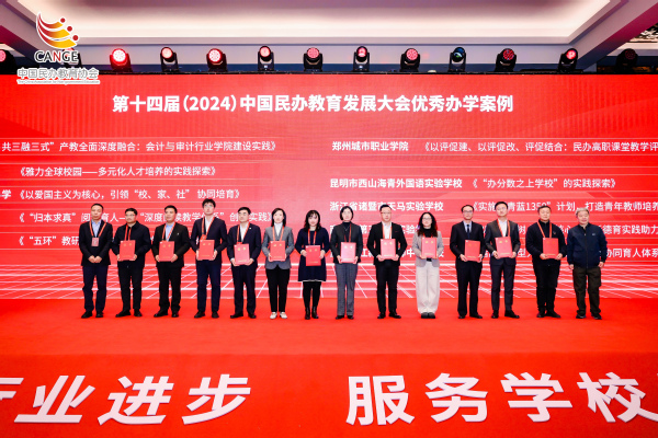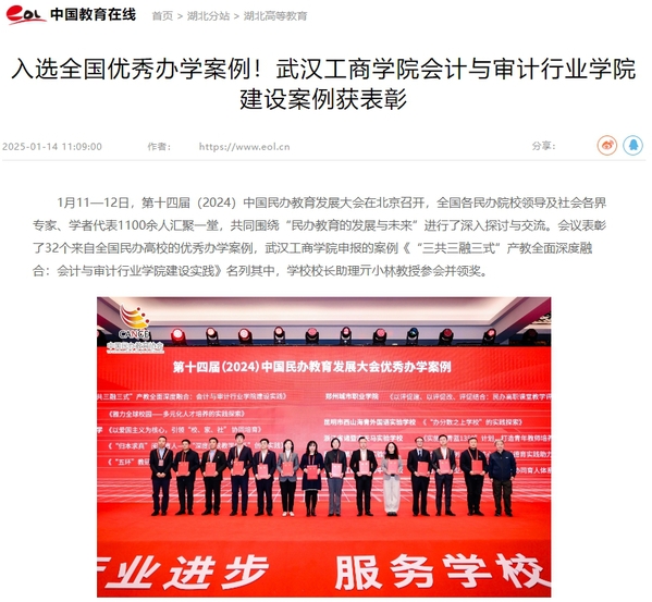 1月11—12日,第十四届(2024)中国民办教育发展大会在北京召开,全国各民办院校领导及社会各界专家、学者代表1100余人汇聚一堂,共同围绕“民办教育的发展与未来”进行了深入探讨与交流。会议表彰了32个来自全国民办高校的优秀办学案例,武汉工商学院申报的案例《“三共三融三式”产教全面深度融合:会计与审计行业学院建设实践》名列其中,学校管理学院教授亓小林参会并领奖。