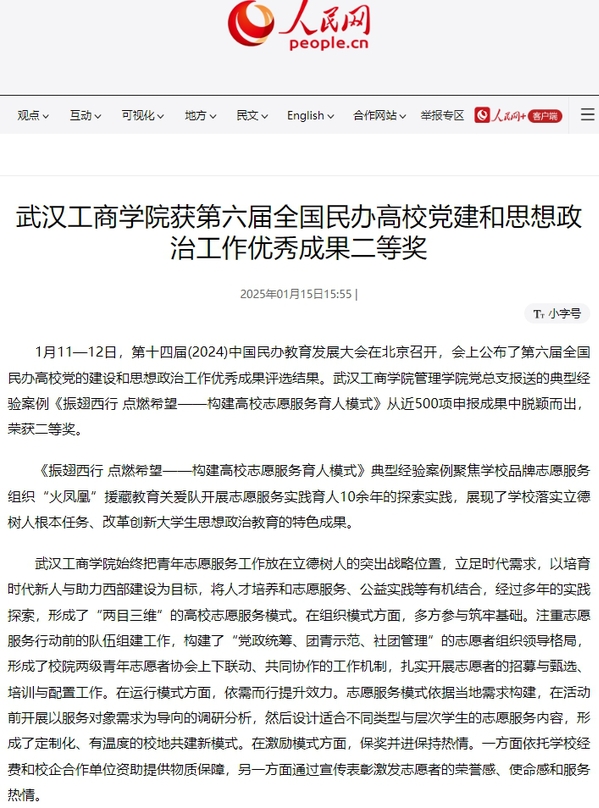 1月11—12日,第十四届(2024)中国民办教育发展大会在北京召开,会上公布了第六届全国民办高校党的建设和思想政治工作优秀成果评选结果。武汉工商学院管理学院党总支报送的典型经验案例《振翅西行 点燃希望——构建高校志愿服务育人模式》从近500项申报成果中脱颖而出,荣获二等奖。