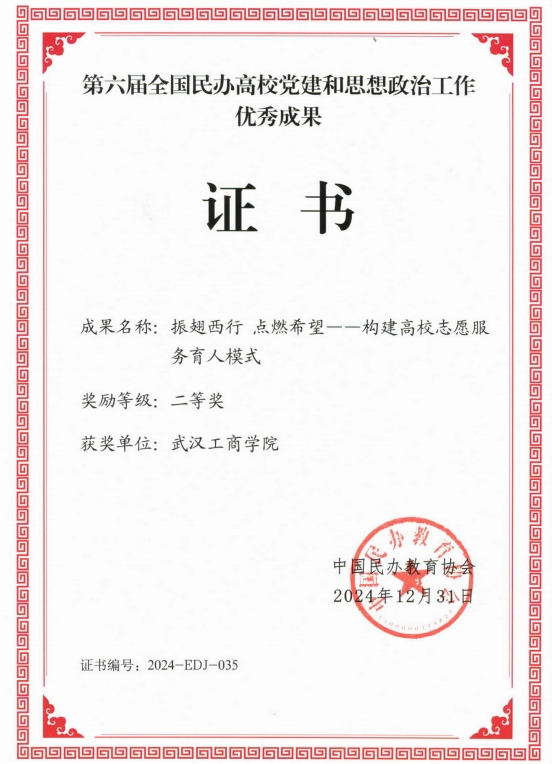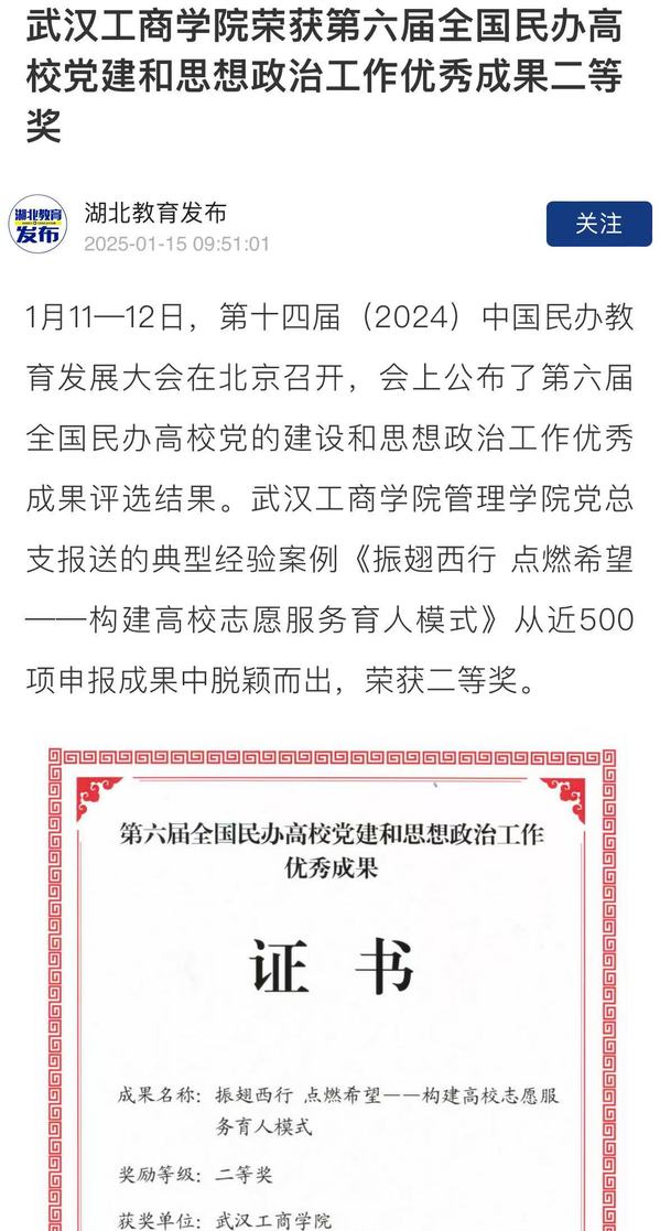 1月11—12日,第十四届(2024)中国民办教育发展大会在北京召开,会上公布了第六届全国民办高校党的建设和思想政治工作优秀成果评选结果。武汉工商学院管理学院党总支报送的典型经验案例《振翅西行 点燃希望——构建高校志愿服务育人模式》从近500项申报成果中脱颖而出,荣获二等奖。