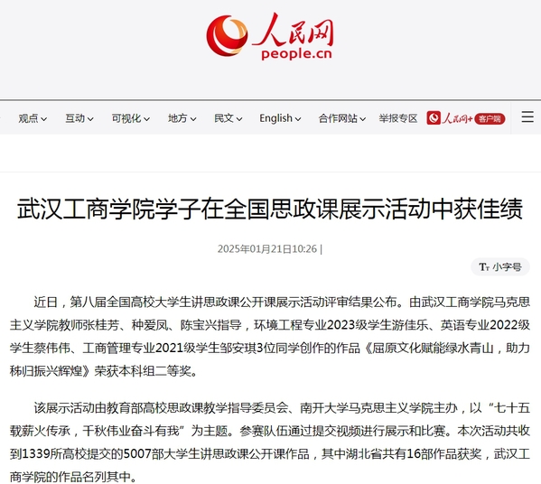 近日,第八届全国高校大学生讲思政课公开课展示活动评审结果公布。由武汉工商学院马克思主义学院教师张桂芳、种爱凤、陈宝兴指导,环境工程专业2023级学生游佳乐、英语专业2022级学生蔡伟伟、工商管理专业2021级学生邹安琪3位同学创作的作品《屈原文化赋能绿水青山,助力秭归振兴辉煌》荣获本科组二等奖。