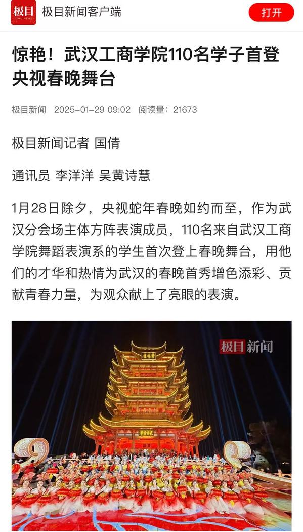 1月28日除夕,央视蛇年春晚如约而至,作为武汉分会场主体方阵表演成员,110名来自武汉工商学院舞蹈表演系的学生首次登上春晚舞台,用他们的才华和热情为武汉的春晚首秀增色添彩、贡献青春力量,为观众献上了亮眼的表演。