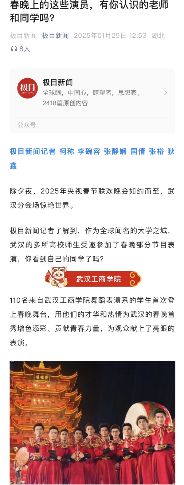 极目新闻记者了解到,作为全球闻名的大学之城,武汉的多所高校师生受邀参加了春晚部分节目表演,你看到自己的同学了吗?