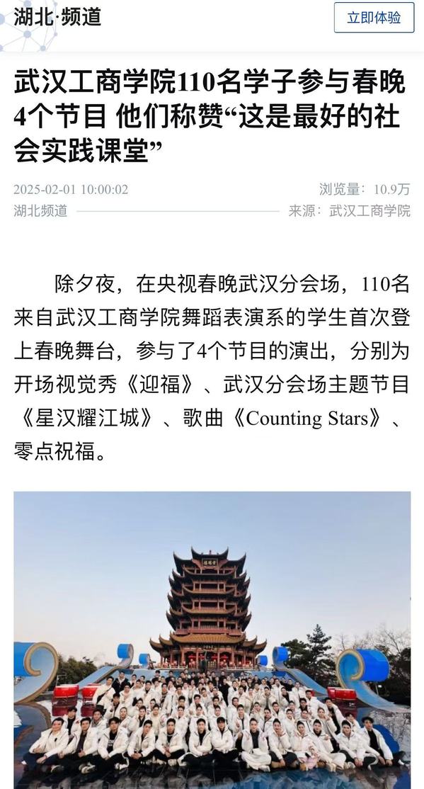 除夕夜,在央视春晚武汉分会场,110名来自武汉工商学院舞蹈表演系的学生首次登上春晚舞台,参与了4个节目的演出,分别为开场视觉秀《迎福》、武汉分会场主题节目《星汉耀江城》、歌曲《Counting Stars》、零点祝福。