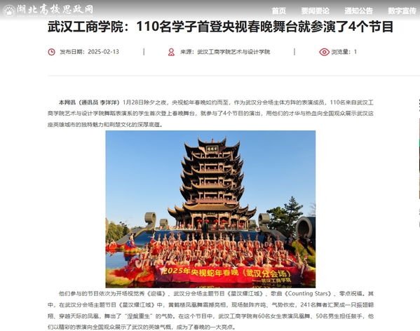 本网讯(通讯员 李洋洋)1月28日除夕之夜,央视蛇年春晚如约而至,作为武汉分会场主体方阵的表演成员,110名来自武汉工商学院艺术与设计学院舞蹈表演系的学生首次登上春晚舞台,就参与了4个节目的演出,用他们的才华与热血向全国观众展示武汉这座英雄城市的独特魅力和荆楚文化的深厚底蕴。