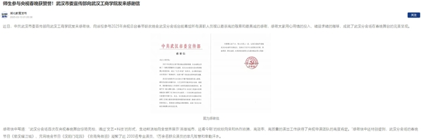 近日,中共武汉市委宣传部向武汉工商学院发来感谢信,向该校参与2025年央视总台春节联欢晚会武汉分会场台前幕后所有演职人员致以最崇高的敬意和最真诚的感谢,感谢大家用心用情的投入、精益求精的雕琢,成就了武汉分会场在春晚舞台的完美呈现。