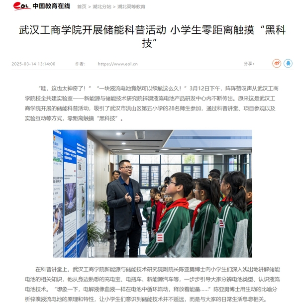 “哇,这也太神奇了!”“一块液流电池竟然可以续航这么久!”3月12日下午,阵阵赞叹声从武汉工商学院校企共建实验室——新能源与储能技术研究院锌溴液流电池产品研发中心内不断传出。原来这是武汉工商学院开展的储能科普活动,吸引了武汉市洪山区第五小学的28名师生参加,通过科普讲堂、项目参观以及实验互动等方式,零距离触摸“黑科技”。
