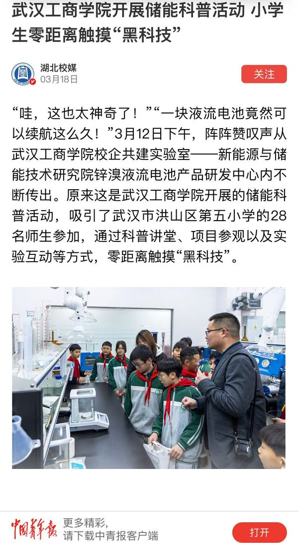 “哇,这也太神奇了!”“一块液流电池竟然可以续航这么久!”3月12日下午,阵阵赞叹声从武汉工商学院校企共建实验室——新能源与储能技术研究院锌溴液流电池产品研发中心内不断传出。原来这是武汉工商学院开展的储能科普活动,吸引了武汉市洪山区第五小学的28名师生参加,通过科普讲堂、项目参观以及实验互动等方式,零距离触摸“黑科技”。