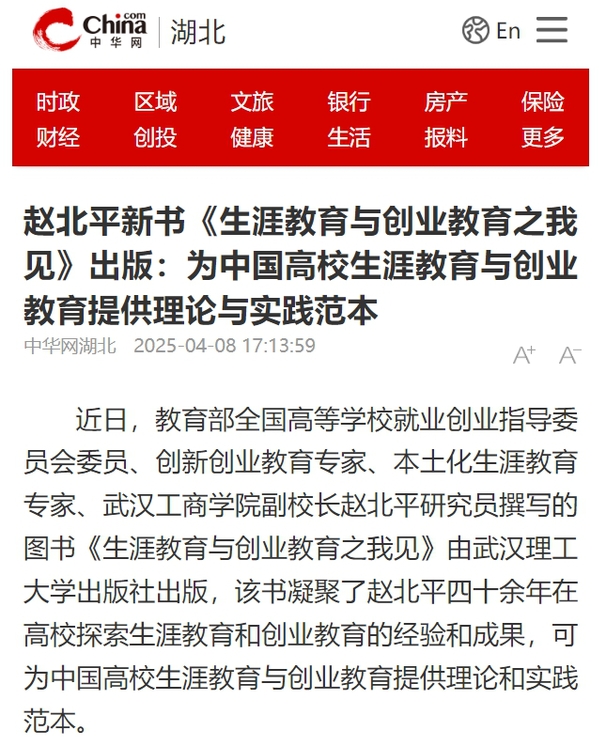 近日,教育部全国高等学校就业创业指导委员会委员、创新创业教育专家、本土化生涯教育专家、武汉工商学院副校长赵北平研究员撰写的图书《生涯教育与创业教育之我见》由武汉理工大学出版社出版,该书凝聚了赵北平四十余年在高校探索生涯教育和创业教育的经验和成果,可为中国高校生涯教育与创业教育提供理论和实践范本。
