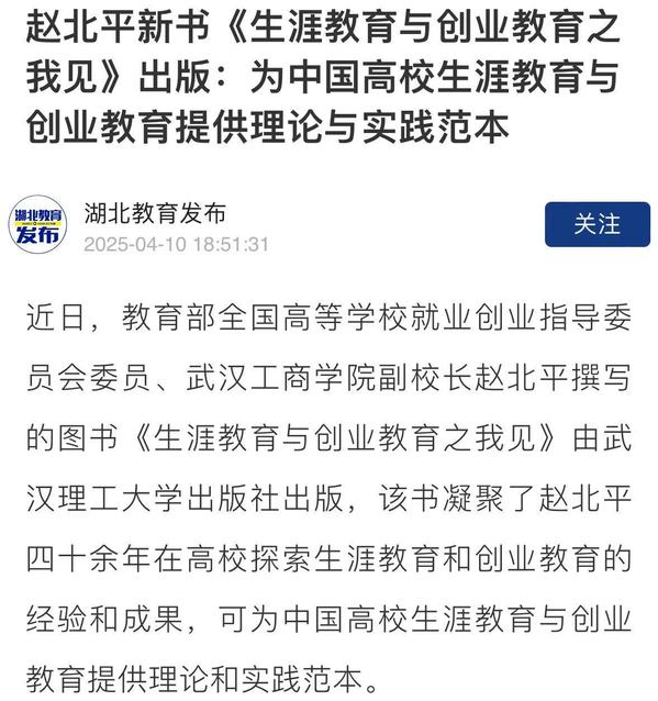 据悉,近年来,赵北平在武汉工商学院探索校本化生涯教育工作理念和模式,取得了显著成果:学校获批湖北省生涯教育本土化探索试点高校;“静思生涯咨询工作室”获首批湖北省特色生涯咨询工作室;学校申报的案例《3+2+N 生涯教育课程体系建设》入选2024年全省生涯教育工作案例;学校生涯教育科研项目获湖北省2024年教育评价改革试点项目和湖北省2024年度教育科学规划项目立项。学校创业教育在全国高校也具有典型示范意义,荣获“全国深化创新创业改革示范高校”“2018年度全国创新创业典型经验高校”等国家级荣誉,获批湖北省大学生创业示范基地、湖北省大学生创业孵化示范基地、湖北省创业学院、武汉市创业学院等。