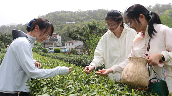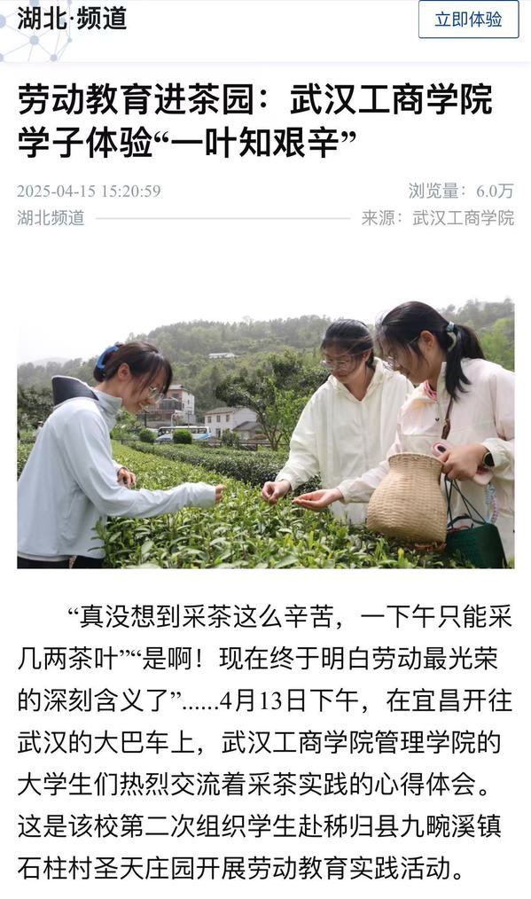“真没想到采茶这么辛苦,一下午只能采几两茶叶”“是啊!现在终于明白劳动最光荣的深刻含义了”......4月13日下午,在宜昌开往武汉的大巴车上,武汉工商学院管理学院的大学生们热烈交流着采茶实践的心得体会。这是该校第二次组织学生赴秭归县九畹溪镇石柱村圣天庄园开展劳动教育实践活动。