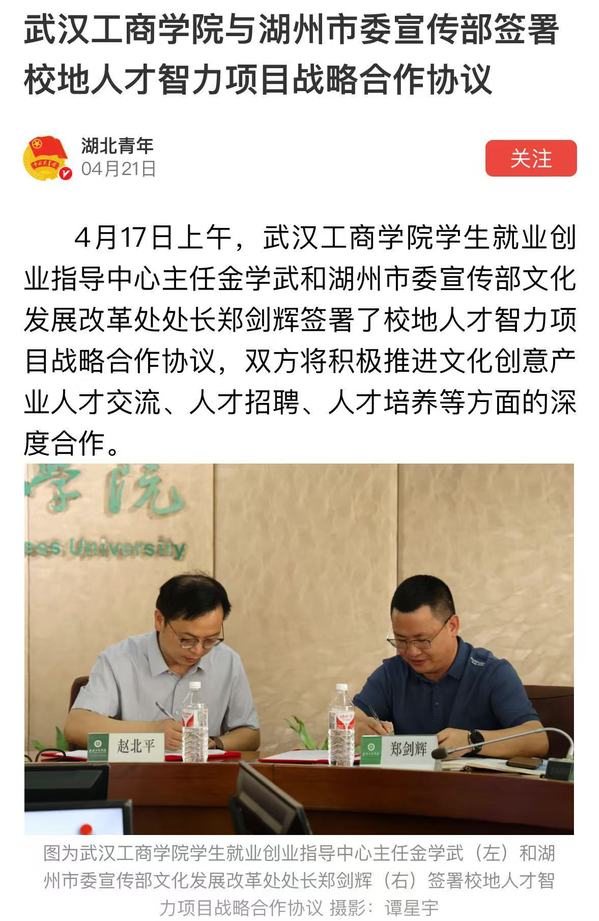 4月17日上午,武汉工商学院学生就业创业指导中心主任金学武和湖州市委宣传部文化发展改革处处长郑剑辉签署了校地人才智力项目战略合作协议,双方将积极推进文化创意产业人才交流、人才招聘、人才培养等方面的深度合作。