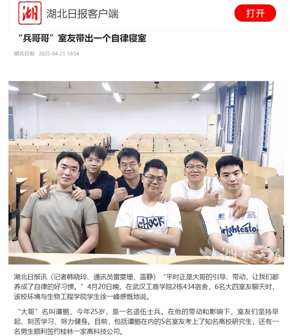 湖北日报讯(记者韩晓玲、通讯员雷雯珊、蓝静)“平时正是大哥的引导、带动,让我们都养成了自律的好习惯。”4月20日晚,在武汉工商学院2栋434宿舍,6名大四室友聊天时,该校环境与生物工程学院学生徐一峰感慨地说。