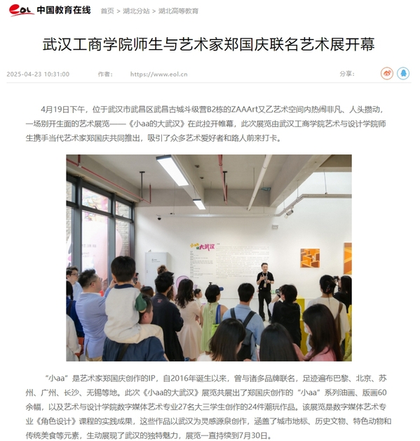 “小aa”是艺术家郑国庆创作的IP,自2016年诞生以来,曾与诸多品牌联名,足迹遍布巴黎、北京、苏州、广州、长沙、无锡等地。此次《小aa的大武汉》展览共展出了郑国庆创作的“小aa”系列油画、版画60余幅,以及艺术与设计学院数字媒体艺术专业27名大三学生创作的24件潮玩作品。该展览是数字媒体艺术专业《角色设计》课程的实践成果,这些作品以武汉为灵感源泉创作,涵盖了城市地标、历史文物、特色动物和传统美食等元素,生动展现了武汉的独特魅力,展览一直持续到7月30日。