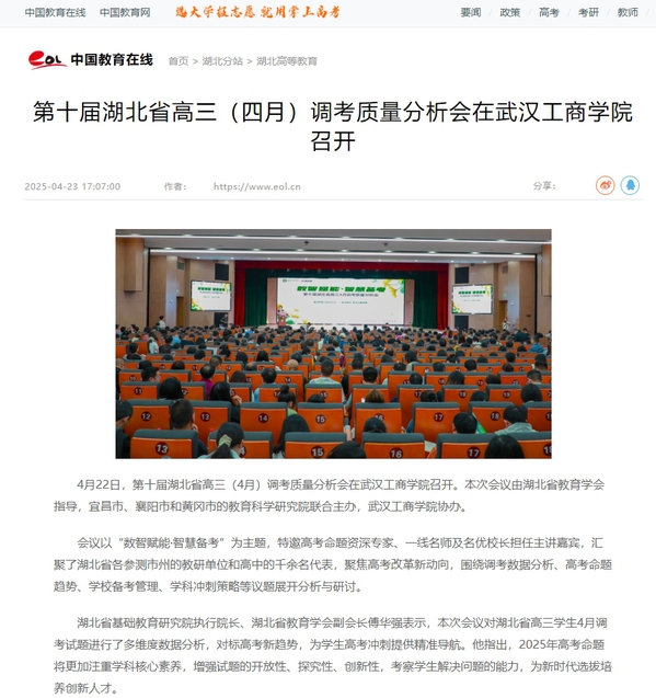 4月22日,第十届湖北省高三(4月)调考质量分析会在武汉工商学院召开。本次会议由湖北省教育学会指导,宜昌市、襄阳市和黄冈市的教育科学研究院联合主办,武汉工商学院协办。