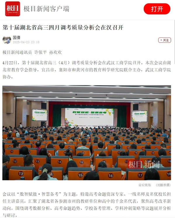 4月22日,第十届湖北省高三(4月)调考质量分析会在武汉工商学院召开。本次会议由湖北省教育学会指导,宜昌市、襄阳市和黄冈市的教育科学研究院联合主办,武汉工商学院协办。