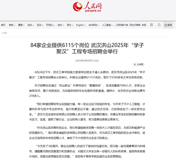 本次招聘会还通过“洪山就业”抖音号进行“直播探岗”,在线观看超7000人次,多家企业接受采访,推介优质岗位,为没能到场的毕业生提供求职通道。据统计,当天初步达成就业意向230多人。