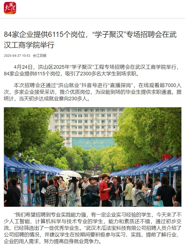 4月24日,洪山区2025年“学子聚汉”工程专场招聘会在武汉工商学院举行,84家企业提供6115个岗位,吸引了2300多名大学生到场求职。