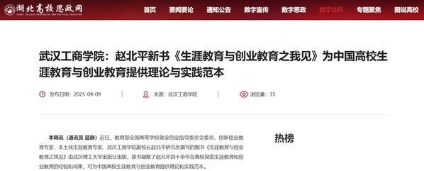 本网讯(通讯员 蓝静)近日,教育部全国高等学校就业创业指导委员会委员、创新创业教育专家、本土化生涯教育专家、武汉工商学院副校长赵北平研究员撰写的图书《生涯教育与创业教育之我见》由武汉理工大学出版社出版,该书凝聚了赵北平四十余年在高校探索生涯教育和创业教育的经验和成果,可为中国高校生涯教育与创业教育提供理论和实践范本。