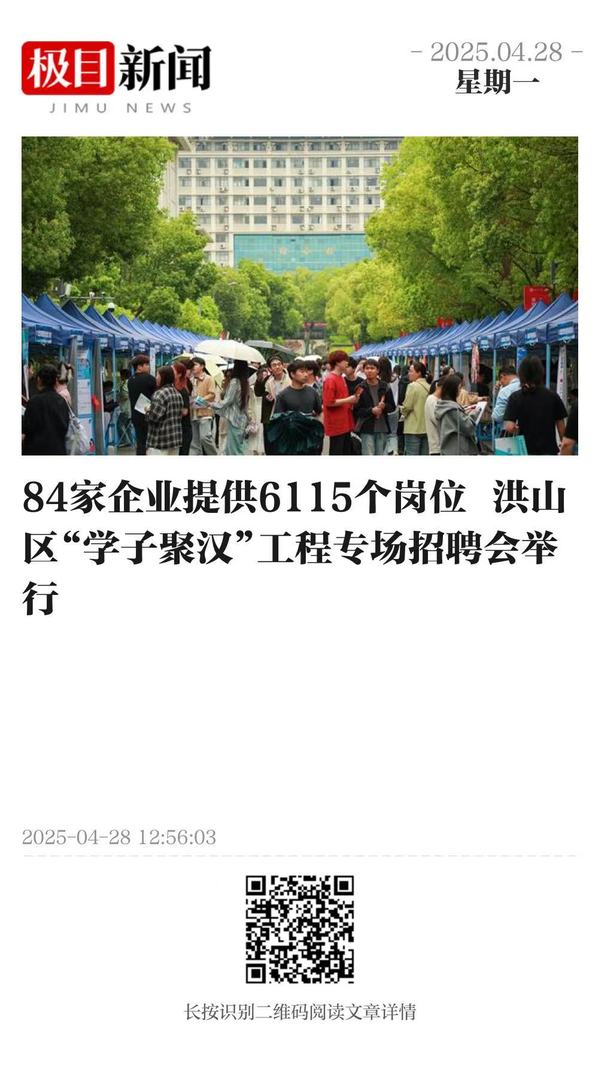 4月24日下午,武汉工商学院南大楼至综合楼主干道人头攒动,武汉市洪山区2025年“学子聚汉”工程专场招聘会火热举行。84家企业提供6115个岗位,吸引了2300多名大学生到场求职。