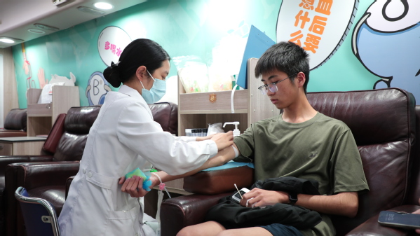 图为爱心学子在献血 摄影:芮雨欣