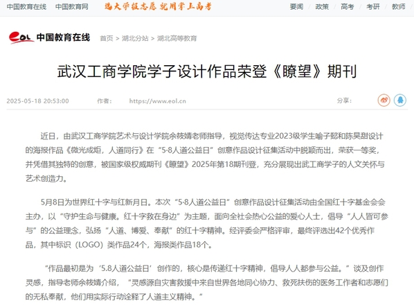 近日,由武汉工商学院艺术与设计学院余筱婧老师指导,视觉传达专业2023级学生喻子懿和陈昊甜设计的海报作品《微光成炬,人道同行》在“5·8人道公益日”创意作品设计征集活动中脱颖而出,荣获一等奖,并凭借其独特的创意,被国家级权威期刊《瞭望》2025年第18期刊登,充分展现出武工商学子的人文关怀与艺术创造力。