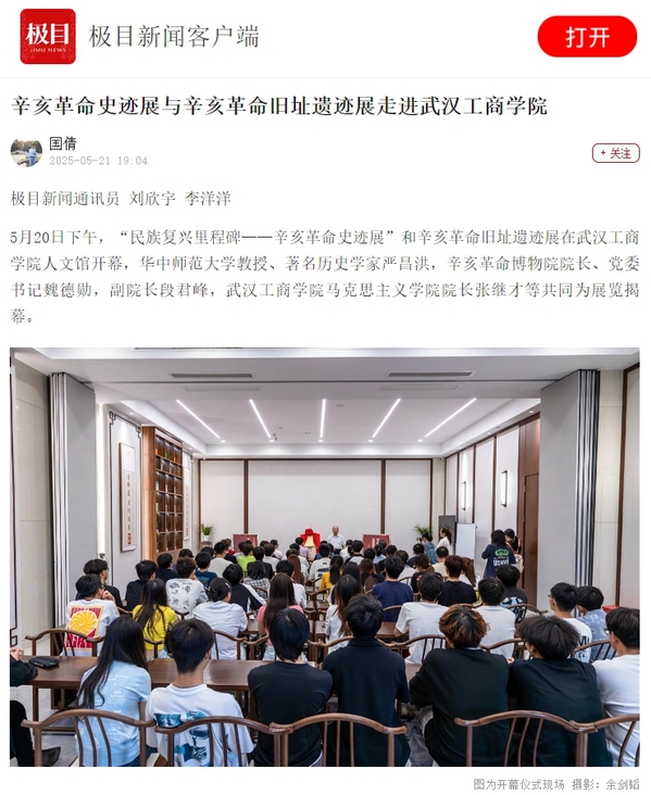 5月20日下午,“民族复兴里程碑——辛亥革命史迹展”和辛亥革命旧址遗迹展在武汉工商学院人文馆开幕,华中师范大学教授、著名历史学家严昌洪,辛亥革命博物院院长、党委书记魏德勋,副院长段君峰,武汉工商学院马克思主义学院院长张继才等共同为展览揭幕。