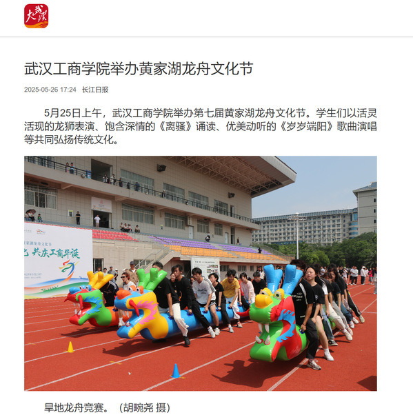 5月25日上午,武汉工商学院举办第七届黄家湖龙舟文化节。学生们以活灵活现的龙狮表演、饱含深情的《离骚》诵读、优美动听的《岁岁端阳》歌曲演唱等共同弘扬传统文化。