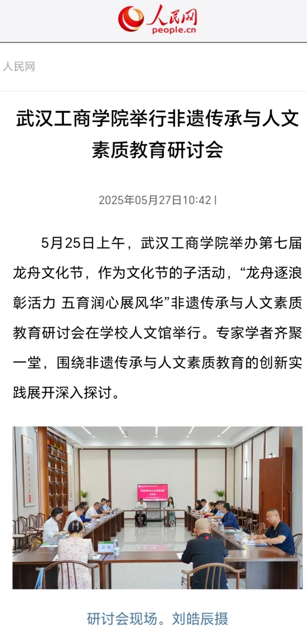 5月25日上午,武汉工商学院举办第七届龙舟文化节,作为文化节的子活动,“龙舟逐浪彰活力 五育润心展风华”非遗传承与人文素质教育研讨会在学校人文馆举行。专家学者齐聚一堂,围绕非遗传承与人文素质教育的创新实践展开深入探讨。