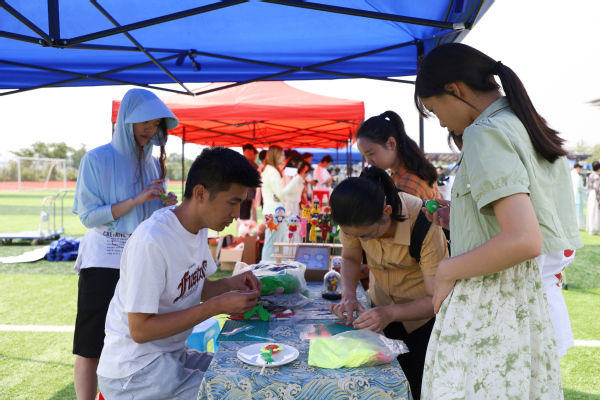 田径场的另一边,非遗集市热闹非凡,师生们纷纷体验射五毒、制作香囊、编五彩绳、蹴鞠、投壶、制作漆扇、演皮影戏等端午民俗及其他传统文化活动,一些非遗传承人还现场教师生们学习剪纸、做糖画、捏面人、草编等非遗技艺,引导师生感受中华文化之美。学生左金萍跟着非遗传承人喻政森学习用草编蚱蜢,拿着自己的草编作品,她兴奋地说:“中国的非遗技艺太厉害了,几根草就可以编出栩栩如生的蚱蜢,这个活动让我近距离感受到了非遗的魅力!”