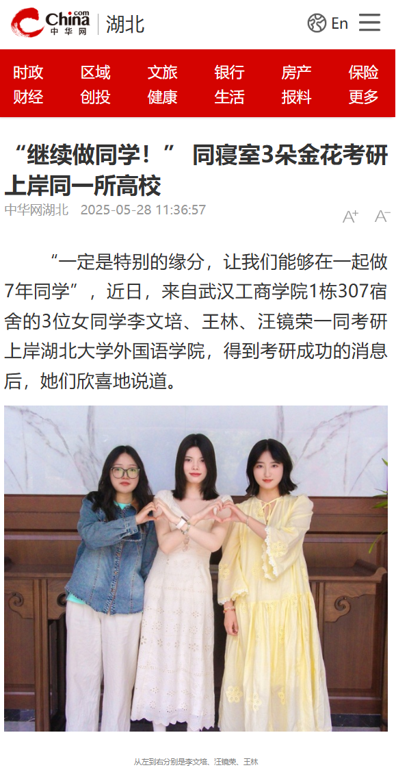 “一定是特别的缘分,让我们能够在一起做7年同学”,近日,来自武汉工商学院1栋307宿舍的3位女同学李文培、王林、汪镜荣一同考研上岸湖北大学外国语学院,得到考研成功的消息后,她们欣喜地说道。