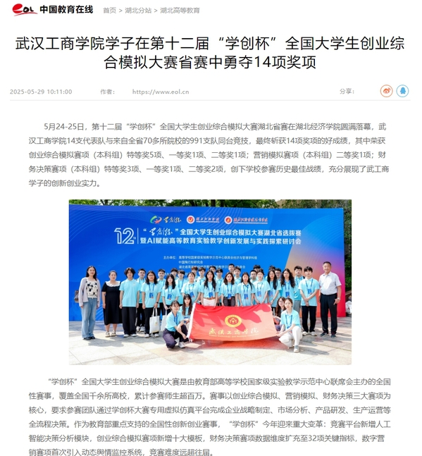 5月24-25日,第十二届“学创杯”全国大学生创业综合模拟大赛湖北省赛在湖北经济学院圆满落幕,武汉工商学院14支代表队与来自全省70多所院校的991支队同台竞技,最终斩获14项奖项的好成绩,其中荣获创业综合模拟赛项(本科组)特等奖5项、一等奖1项、二等奖1项;营销模拟赛项(本科组)二等奖1项;财务决策赛项(本科组)特等奖3项、一等奖1项、二等奖2项,创下学校参赛历史最佳战绩,充分展现了武工商学子的创新创业实力。