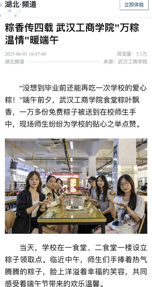 “没想到毕业前还能再吃一次学校的爱心粽!”端午前夕,武汉工商学院食堂粽叶飘香,一万多份免费粽子被送到在校师生手中,现场师生纷纷为学校的贴心之举点赞。