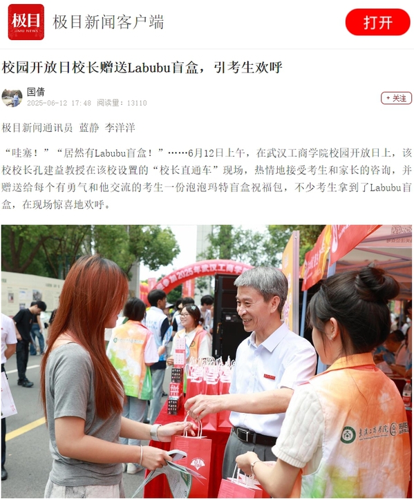 “哇塞!”“居然有Labubu盲盒!”……6月12日上午,在武汉工商学院校园开放日上,该校校长孔建益教授在该校设置的“校长直通车”现场,热情地接受考生和家长的咨询,并赠送给每个有勇气和他交流的考生一份泡泡玛特盲盒祝福包,不少考生拿到了Labubu盲盒,在现场惊喜地欢呼。