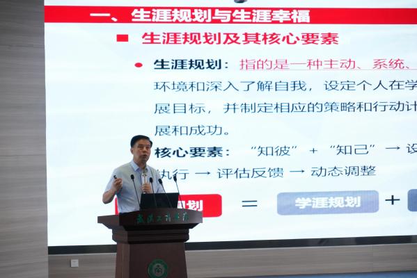 湖北省生涯教育研究会副会长、武汉工商学院副校长赵北平带来《生涯规划与大学生高质量就业》的报告,报告围绕“高质量就业与职业发展”主题,深入阐释产教融合(专创融合)在专业能力培养中的关键作用。他指出,产教融合是提升专业能力的有效路径,应通过项目式教学,让学生在设计、实施、展示过程中,直面真场景、真过程、真需求、真问题,以企业化标准参与实践;同时,借助角色扮演实现职业化体验。
