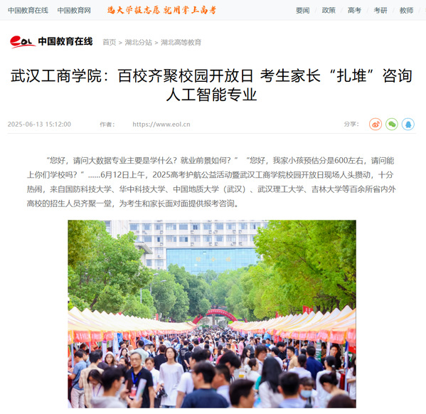 “您好,请问大数据专业主要是学什么?就业前景如何?”“您好,我家小孩预估分是600左右,请问能上你们学校吗?”……6月12日上午,2025高考护航公益活动暨武汉工商学院校园开放日现场人头攒动,十分热闹,来自国防科技大学、华中科技大学、中国地质大学(武汉)、武汉理工大学、吉林大学等百余所省内外高校的招生人员齐聚一堂,为考生和家长面对面提供报考咨询。