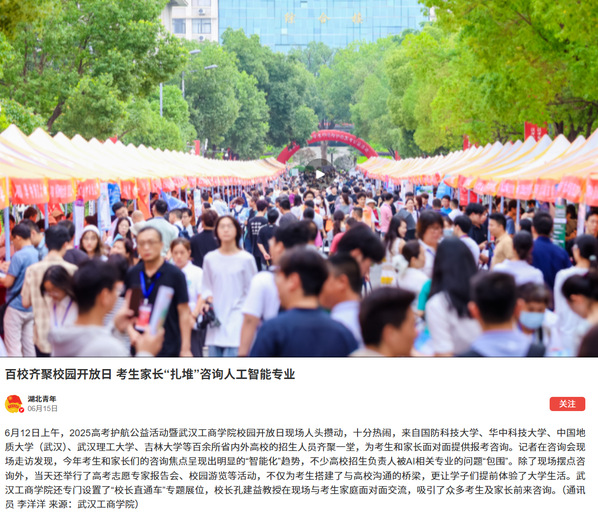 6月12日上午,2025高考护航公益活动暨武汉工商学院校园开放日现场人头攒动,十分热闹,来自国防科技大学、华中科技大学、中国地质大学(武汉)、武汉理工大学、吉林大学等百余所省内外高校的招生人员齐聚一堂,为考生和家长面对面提供报考咨询。记者在咨询会现场走访发现,今年考生和家长们的咨询焦点呈现出明显的“智能化”趋势,不少高校招生负责人被AI相关专业的问题“包围”。除了现场摆点咨询外,当天还举行了高考志愿专家报告会、校园游览等活动,不仅为考生搭建了与高校沟通的桥梁,更让学子们提前体验了大学生活。武汉工商学院还专门设置了“校长直通车”专题展位,校长孔建益教授在现场与考生家庭面对面交流,吸引了众多考生及家长前来咨询。(通讯员 李洋洋)
