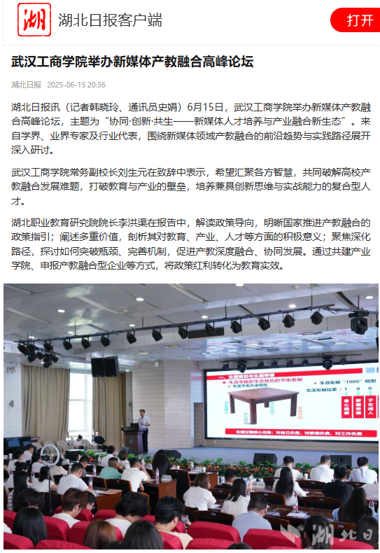 湖北日报讯(记者韩晓玲、通讯员史娟)6月15日,武汉工商学院举办新媒体产教融合高峰论坛,主题为“协同·创新·共生——新媒体人才培养与产业融合新生态”。来自学界、业界专家及行业代表,围绕新媒体领域产教融合的前沿趋势与实践路径展开深入研讨。