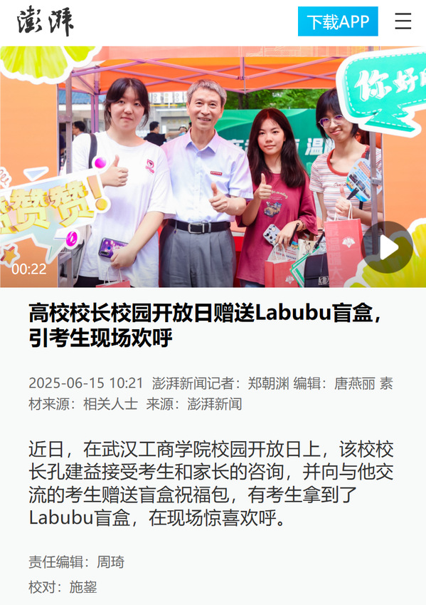 近日,在武汉工商学院校园开放日上,该校校长孔建益接受考生和家长的咨询,并向与他交流的考生赠送盲盒祝福包,有考生拿到了Labubu盲盒,在现场惊喜欢呼。