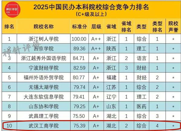 新闻中心讯(记者 李洋洋)6月16日,“神针评价”正式发布了《2025中国民办本科院校综合竞争力排名》榜单,武汉工商学院位居全国第十名、湖北省第二名,在综合类民办本科院校排名中位列全国第四名,获评为中国一流民办本科院校。