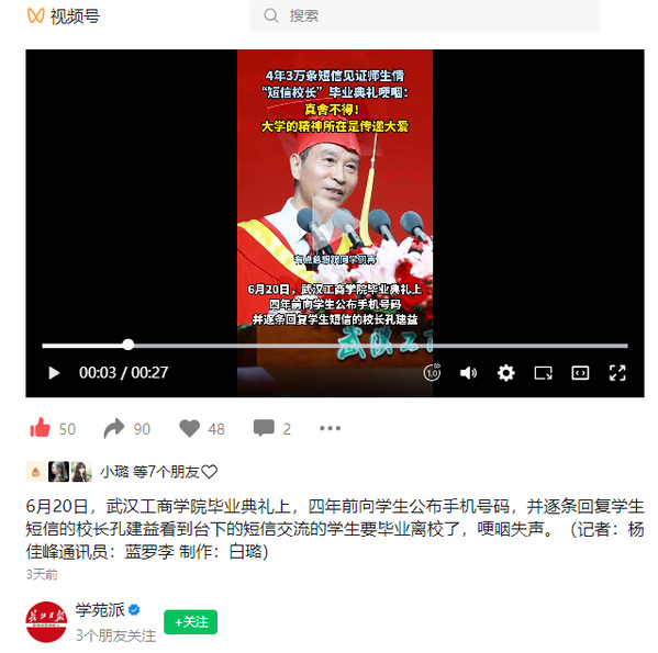6月20日,武汉工商学院毕业典礼上,四年前向学生公布手机号码,并逐条回复学生短信的校长孔建益看到台下的短信交流的学生要毕业离校了,哽咽失声。(记者:杨佳峰通讯员:蓝罗李 制作:白璐)